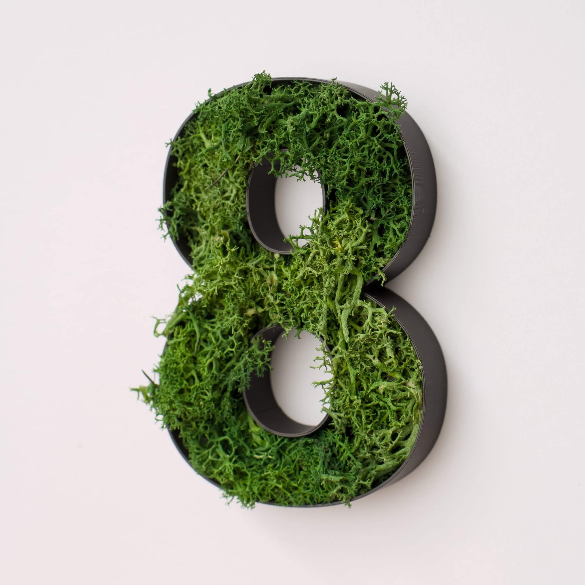 Die “8” steht für Kontinuität, Verbindung und Balance. Als Mooszahl bringt sie Schwung und Symmetrie in deine Gestaltung – ideal für Jubiläen, kreative Zahlenwände oder besondere Daten.